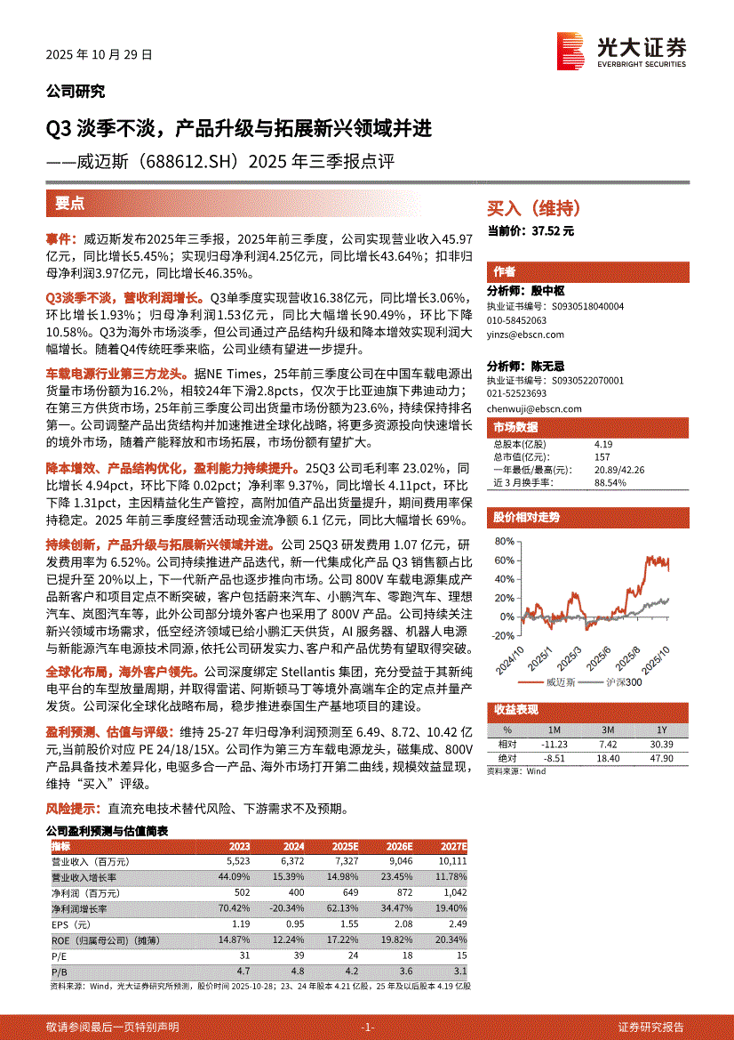 威迈斯研报:光大证券-威迈斯-688612-2025年三季报点评:Q3淡季不淡,产品升级与拓展新兴领域并进-251029