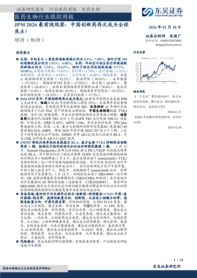 东吴证券-医药生物行业跟踪周报:JPM2026最前线观察,中国创新药再次成为全球焦点!-260118