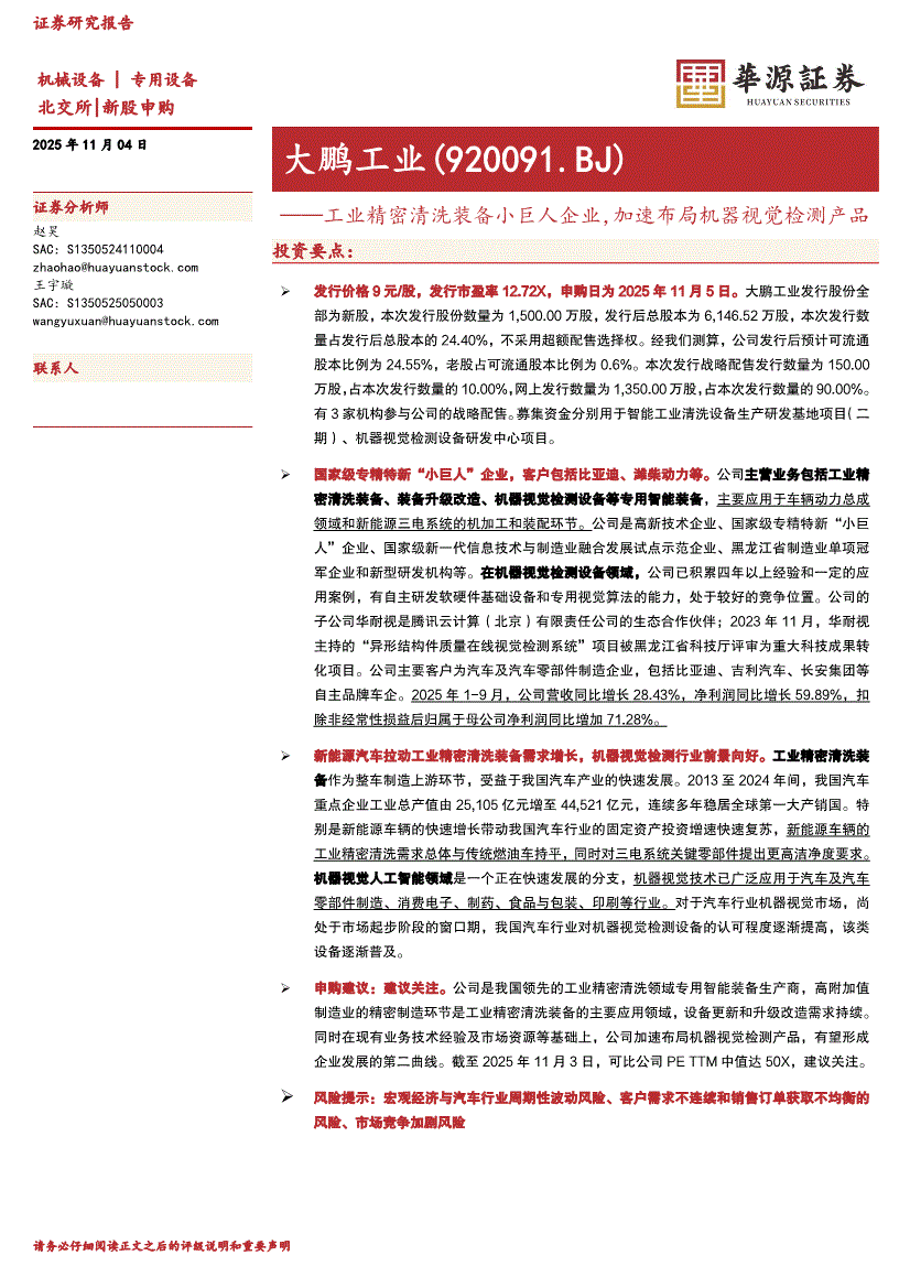 大鹏工业研报:华源证券-大鹏工业-920091-工业精密清洗装备小巨人企业,加速布局机器视觉检测产品-251104