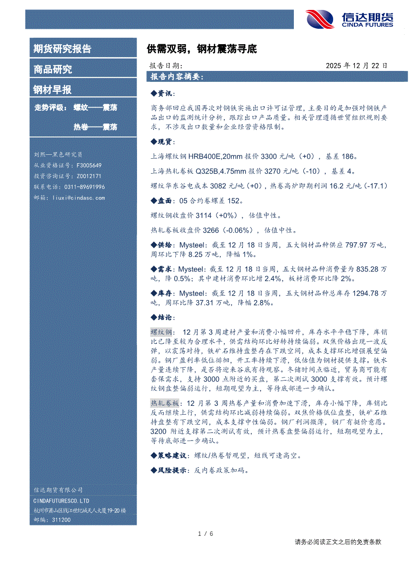 研报:信达期货-钢材早报:供需双弱,钢材震荡寻底-251222