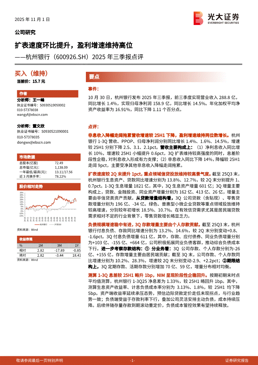 杭州银行研报:光大证券-杭州银行-600926-2025年三季报点评:扩表速度环比提升,盈利增速维持高位-251101