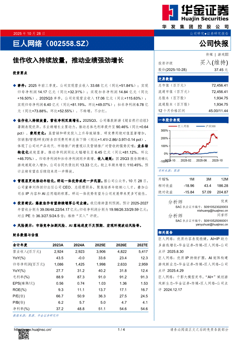 巨人网络研报:华金证券-巨人网络-002558-佳作收入持续放量,推动业绩强劲增长-251028