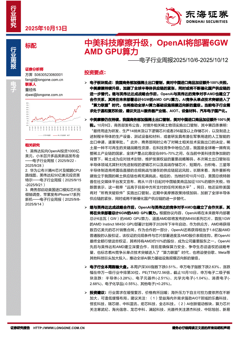 东海证券-电子行业周报:中美科技摩擦升级,OpenAI将部署6GWAMDGPU算力-251013