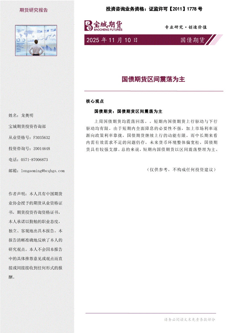 研报:宝城期货-国债期货周报:国债期货区间震荡为主-251110