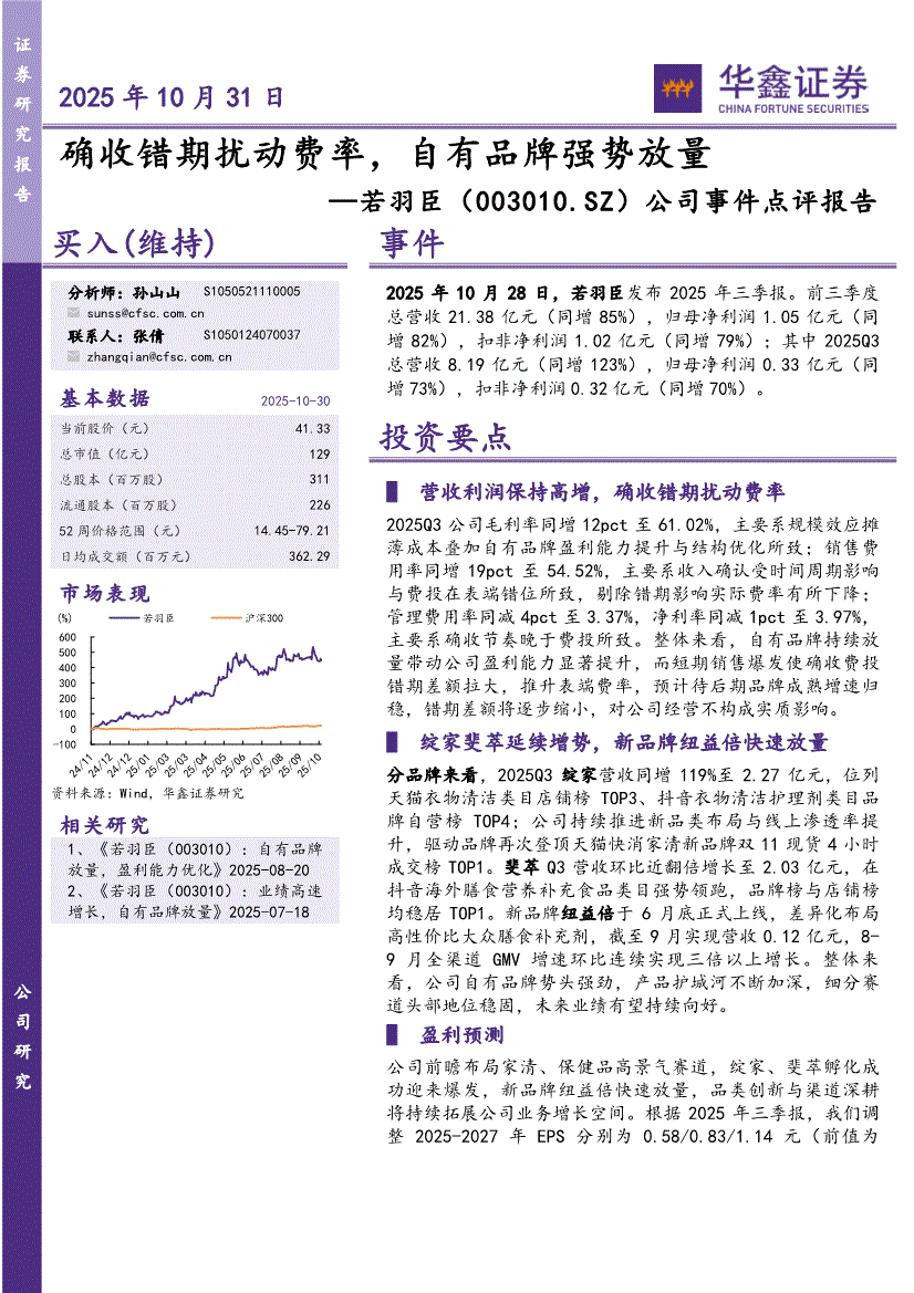 若羽臣研报:华鑫证券-若羽臣-003010-公司事件点评报告:确收错期扰动费率,自有品牌强势放量-251031