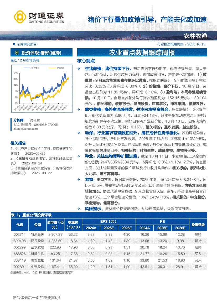 农林牧渔行业研报:财通证券-农业重点数据跟踪周报:猪价下行叠加政策引导,产能去化或加速-251013