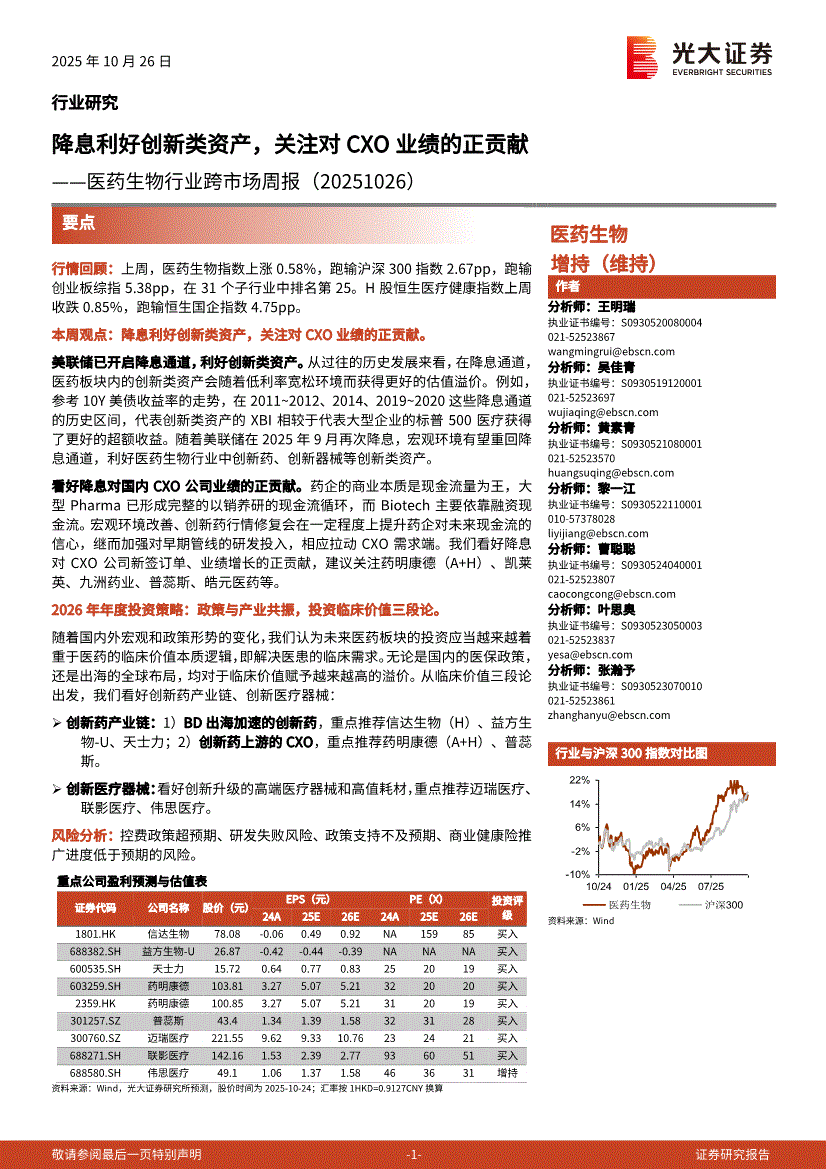 医药生物行业研报:光大证券-医药生物行业跨市场周报(20251026):降息利好创新类资产,关注对CXO业绩的正贡献-251026