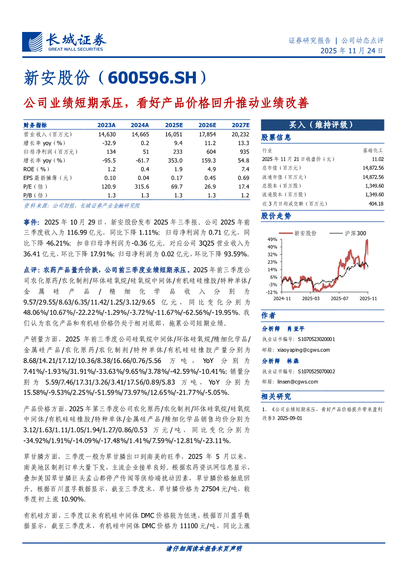 新安股份研报:长城证券-新安股份-600596-公司业绩短期承压,看好产品价格回升推动业绩改善-251124