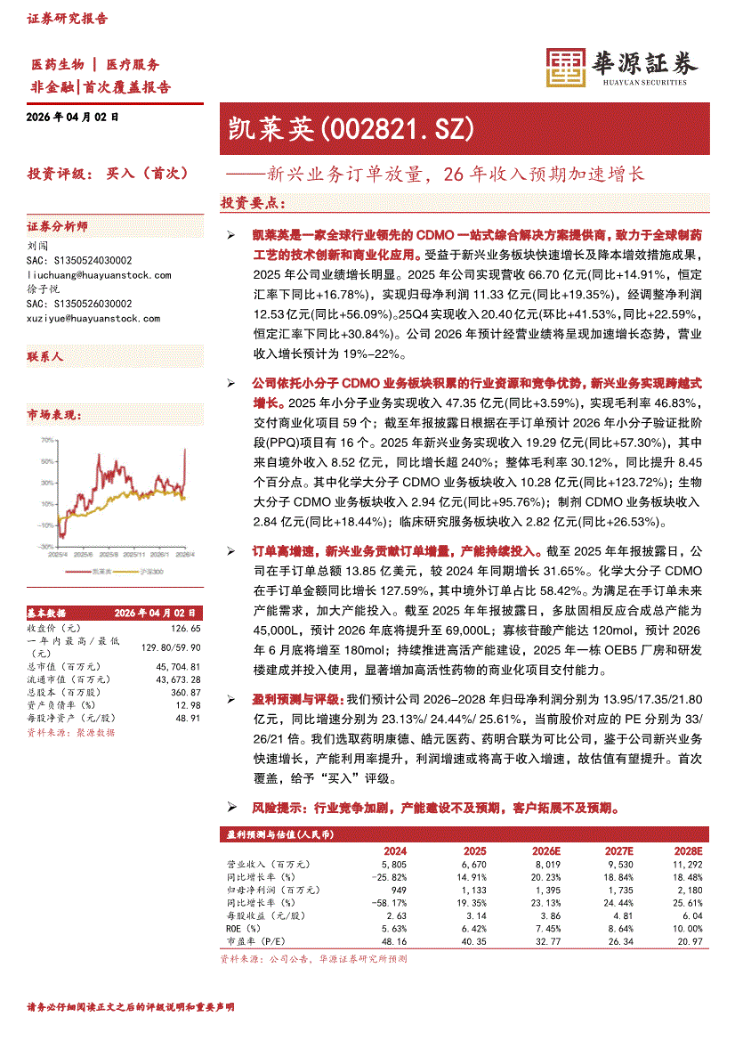 凯莱英研报:华源证券-凯莱英-002821-新兴业务订单放量,26年收入预期加速增长-260402