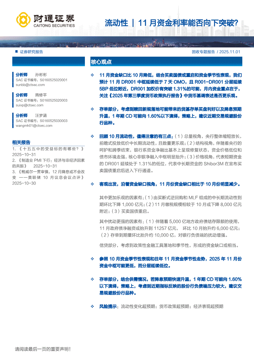研报:财通证券-固收专题报告:流动性| 11月资金利率能否向下突破?-251101