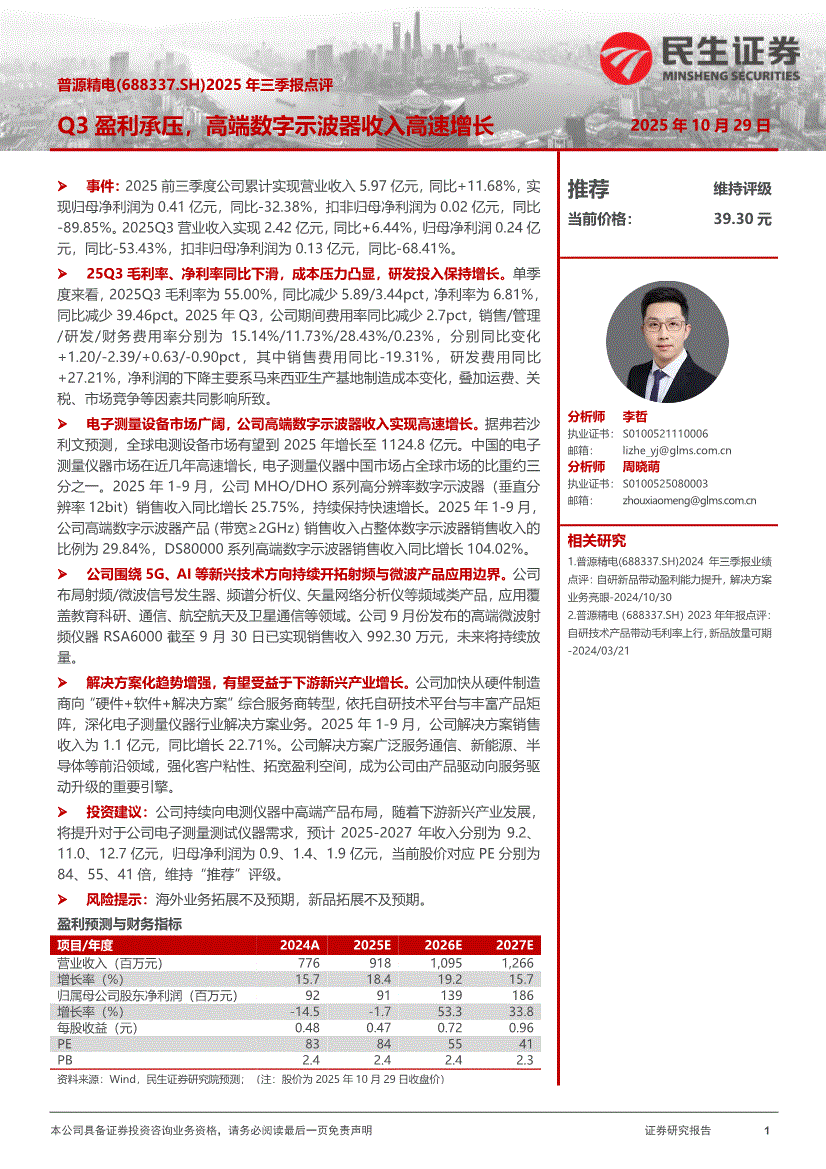 普源精电研报:民生证券-普源精电-688337-2025年三季报点评:Q3盈利承压,高端数字示波器收入高速增长-251029