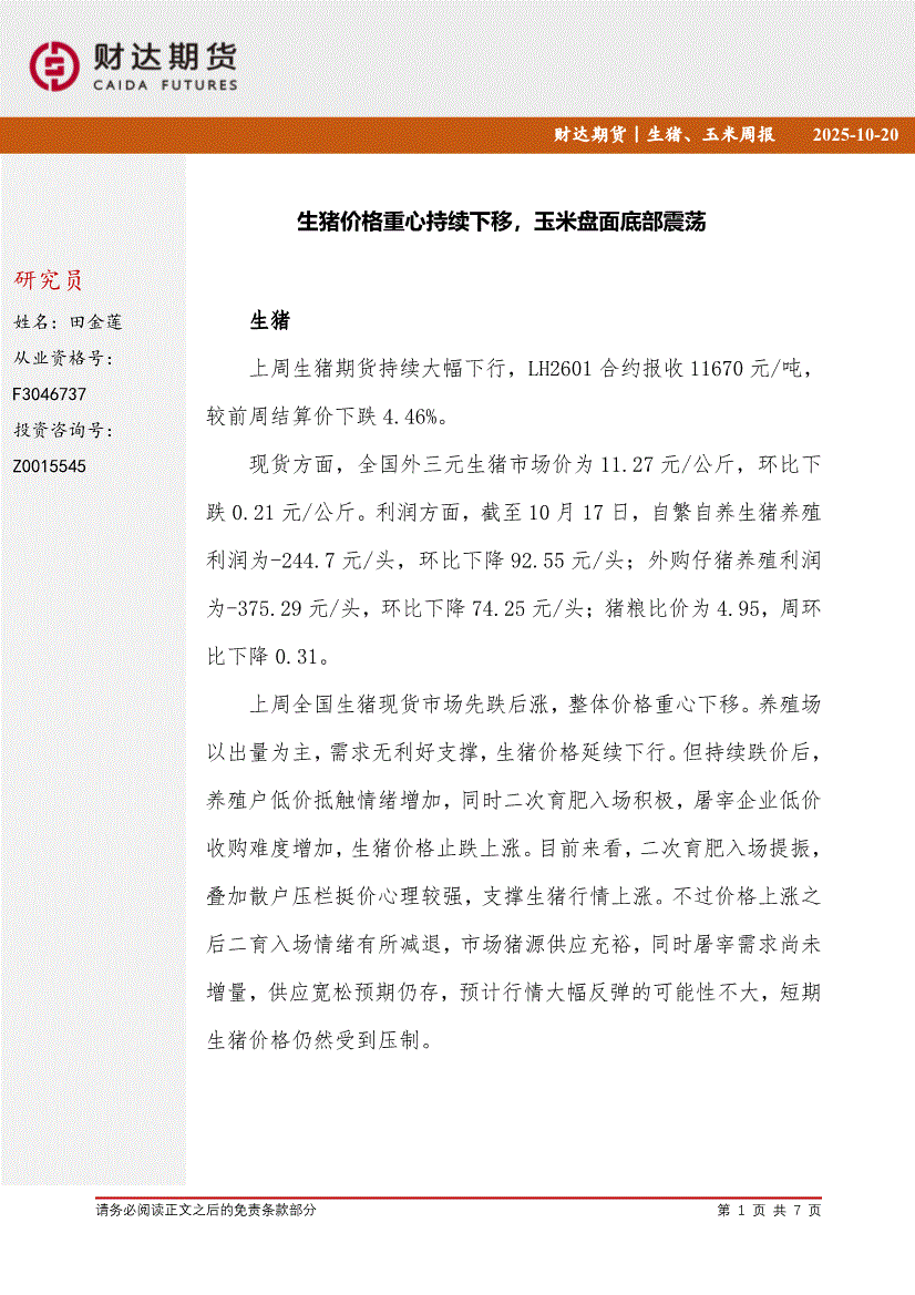 研报:财达期货-生猪、玉米周报:生猪价格重心持续下移,玉米盘面底部震荡-251020