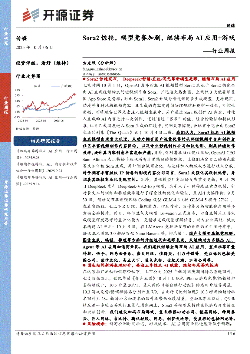 传媒行业研报:开源证券-传媒行业周报:Sora2惊艳,模型竞赛加剧,继续布局AI应用+游戏-251006