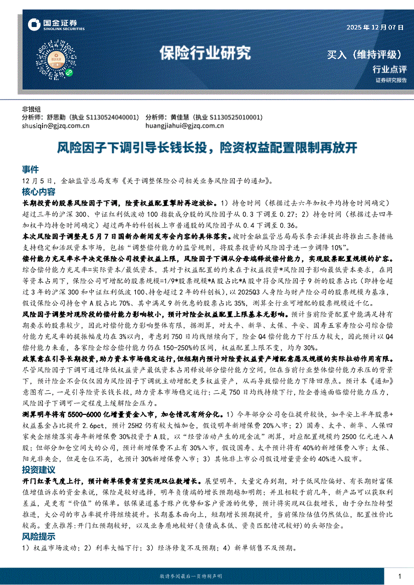 保险行业研报:国金证券-保险行业点评:风险因子下调引导长钱长投,险资权益配置限制再放开-251207