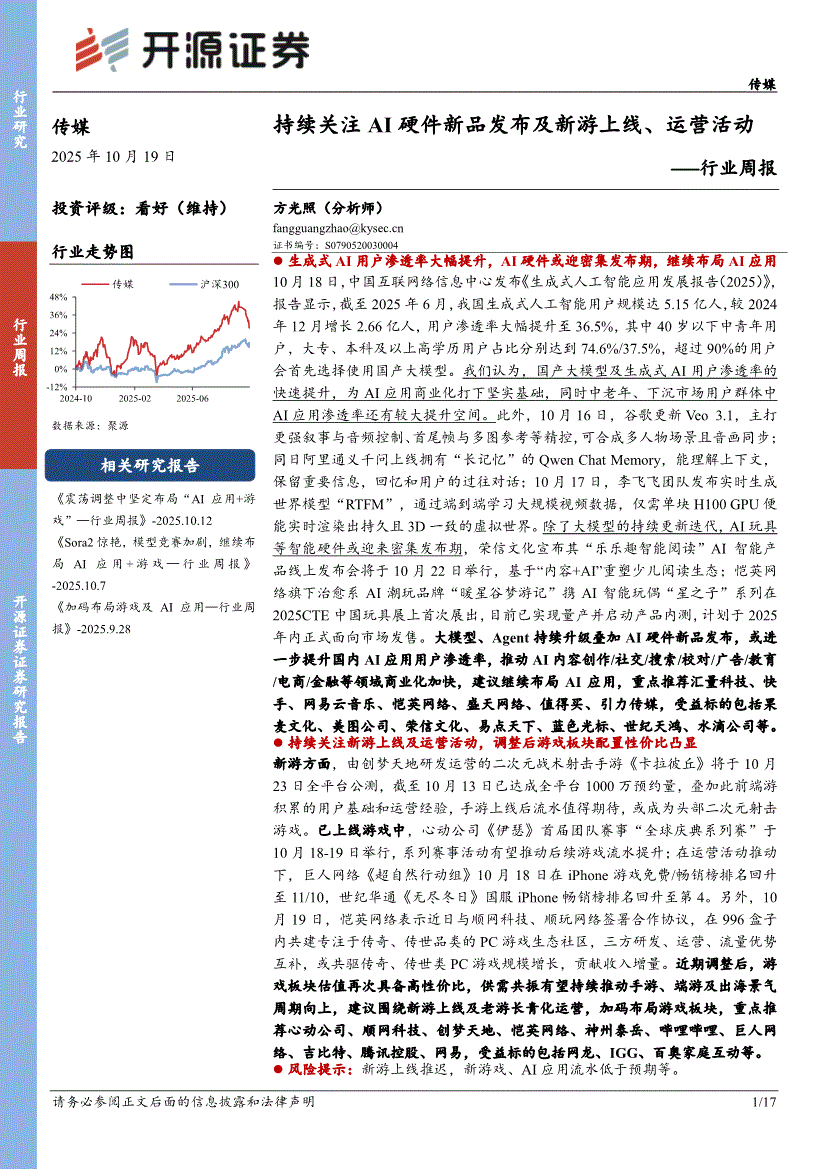 传媒行业研报:开源证券-传媒行业周报:持续关注AI硬件新品发布及新游上线、运营活动-251019