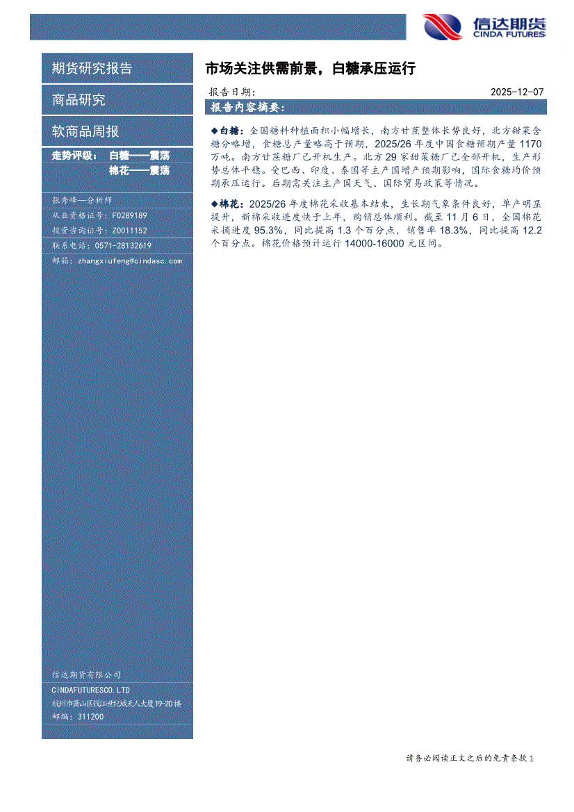 研报:信达期货-软商品周报:市场关注供需前景,白糖承压运行-251207