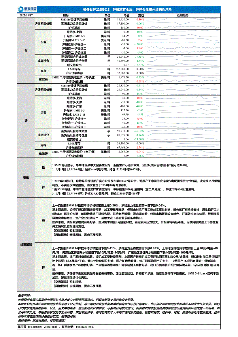 研报:宏源期货-铅锌日评:沪铅或有承压;沪锌关注海外结构性风险-251017