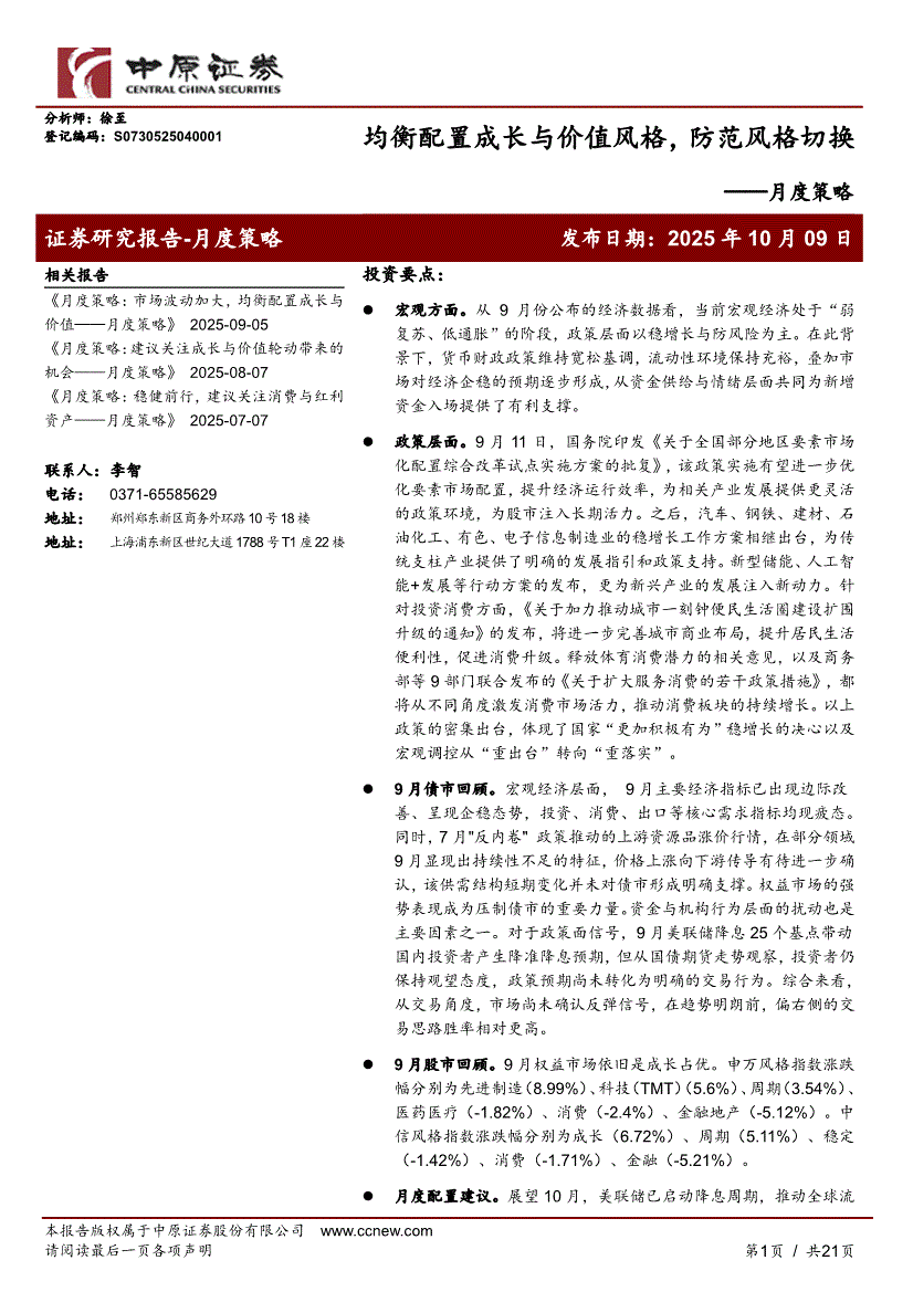 研报:中原证券-月度策略:均衡配置成长与价值风格,防范风格切换-251009