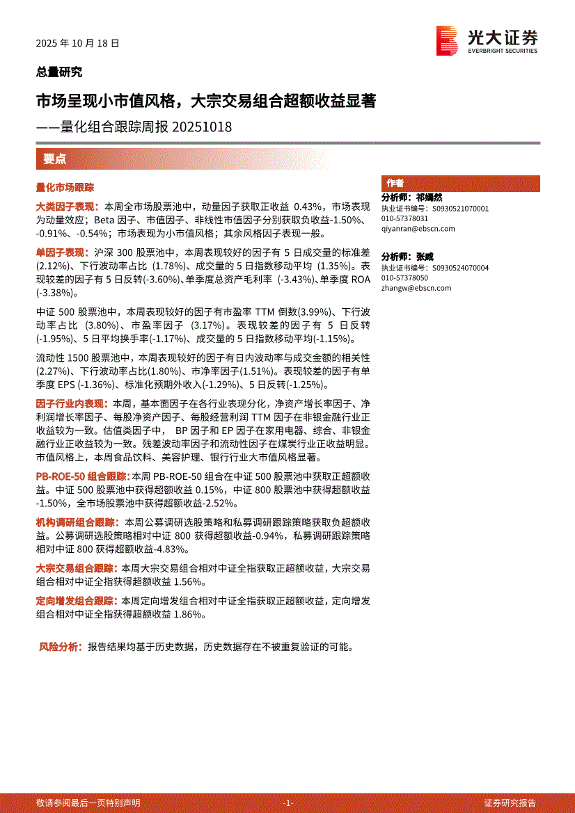 研报:光大证券-量化组合跟踪周报:市场呈现小市值风格,大宗交易组合超额收益显著-251018