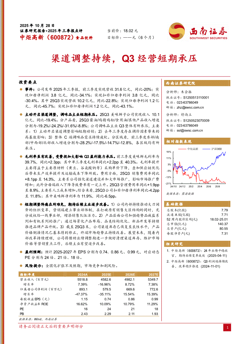 中炬高新研报:西南证券-中炬高新-600872-渠道调整持续,Q3经营短期承压-251028