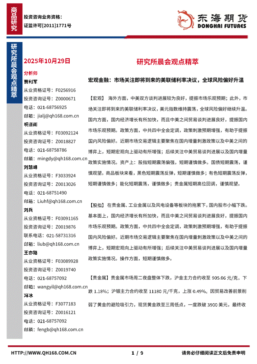研报:东海期货-研究所晨会观点精萃-251029
