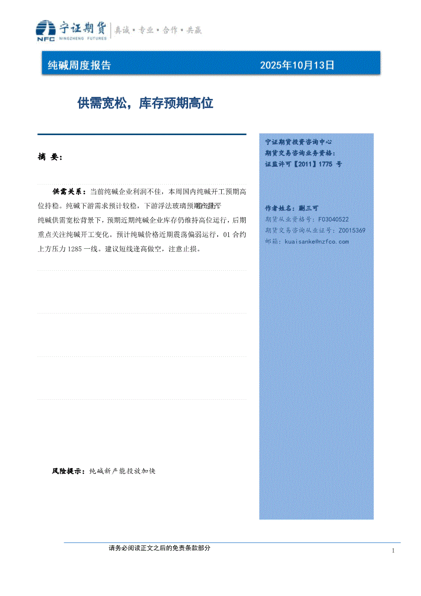 研报:宁证期货-纯碱周度报告:供需宽松,库存预期高位-251013