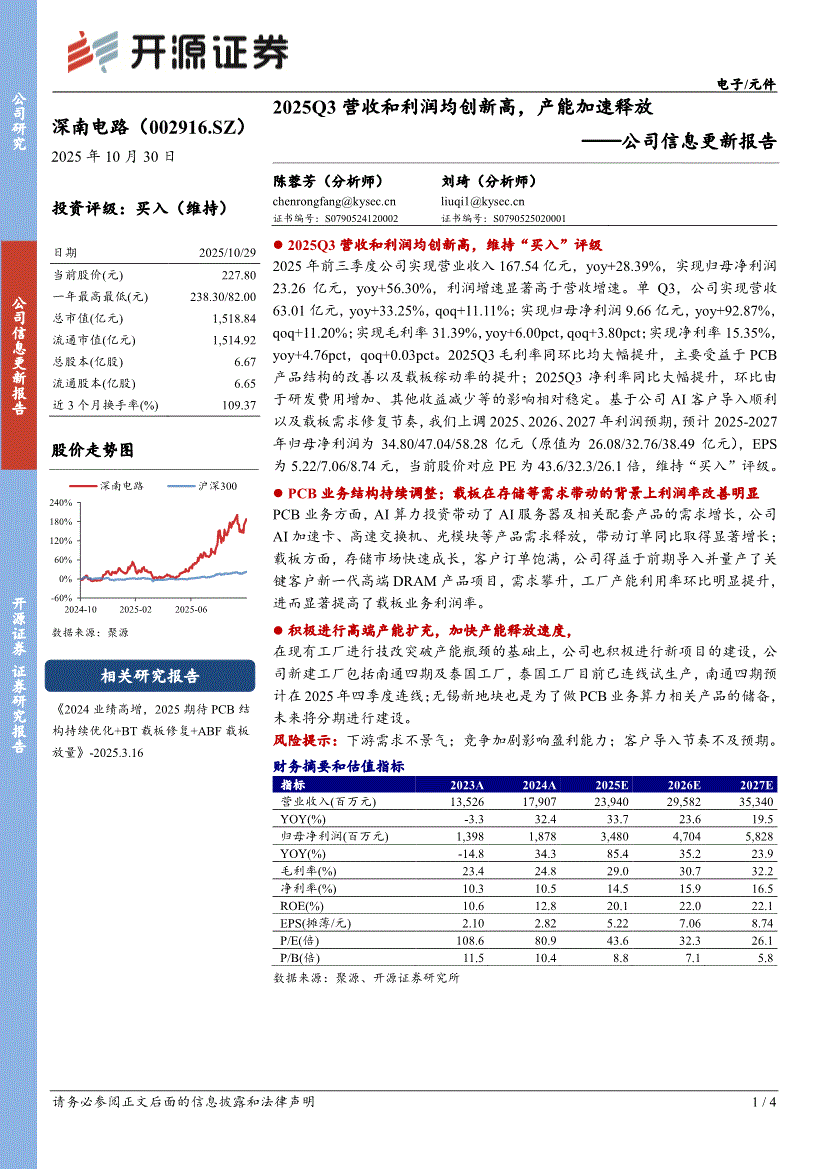 深南电路研报:开源证券-深南电路-002916-公司信息更新报告:2025Q3营收和利润均创新高,产能加速释放-251030