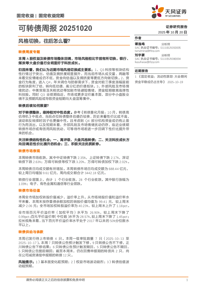 研报:天风证券-可转债周报:风格切换,往后怎么看?-251020