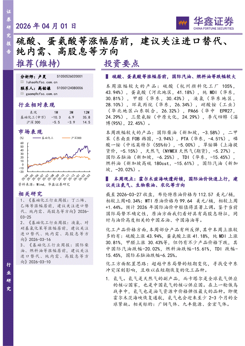 基础化工行业研报:华鑫证券-基础化工行业:硫酸、蛋氨酸等涨幅居前,建议关注进口替代、纯内需、高股息等方向-260401