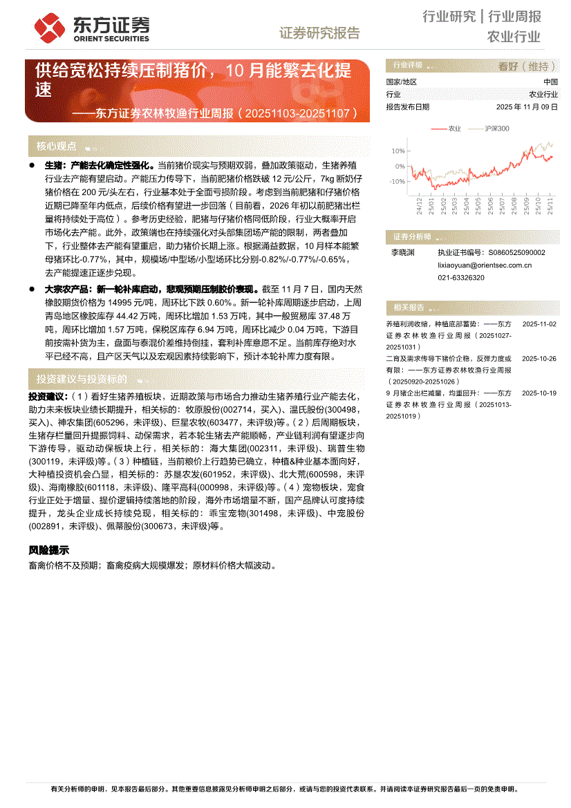 农林牧渔行业研报:东方证券-农林牧渔行业周报:供给宽松持续压制猪价,10月能繁去化提速-251109