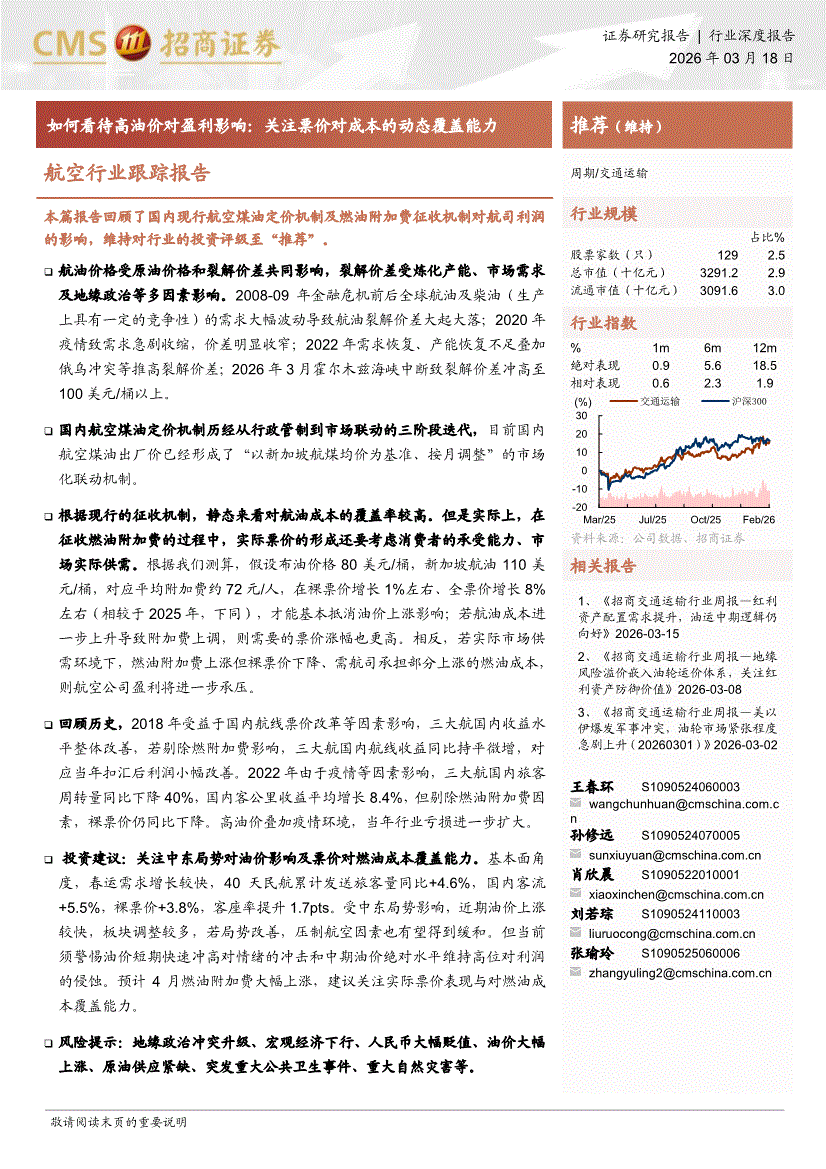 航空行业研报:招商证券-航空行业跟踪报告:如何看待高油价对盈利影响,关注票价对成本的动态覆盖能力-260318