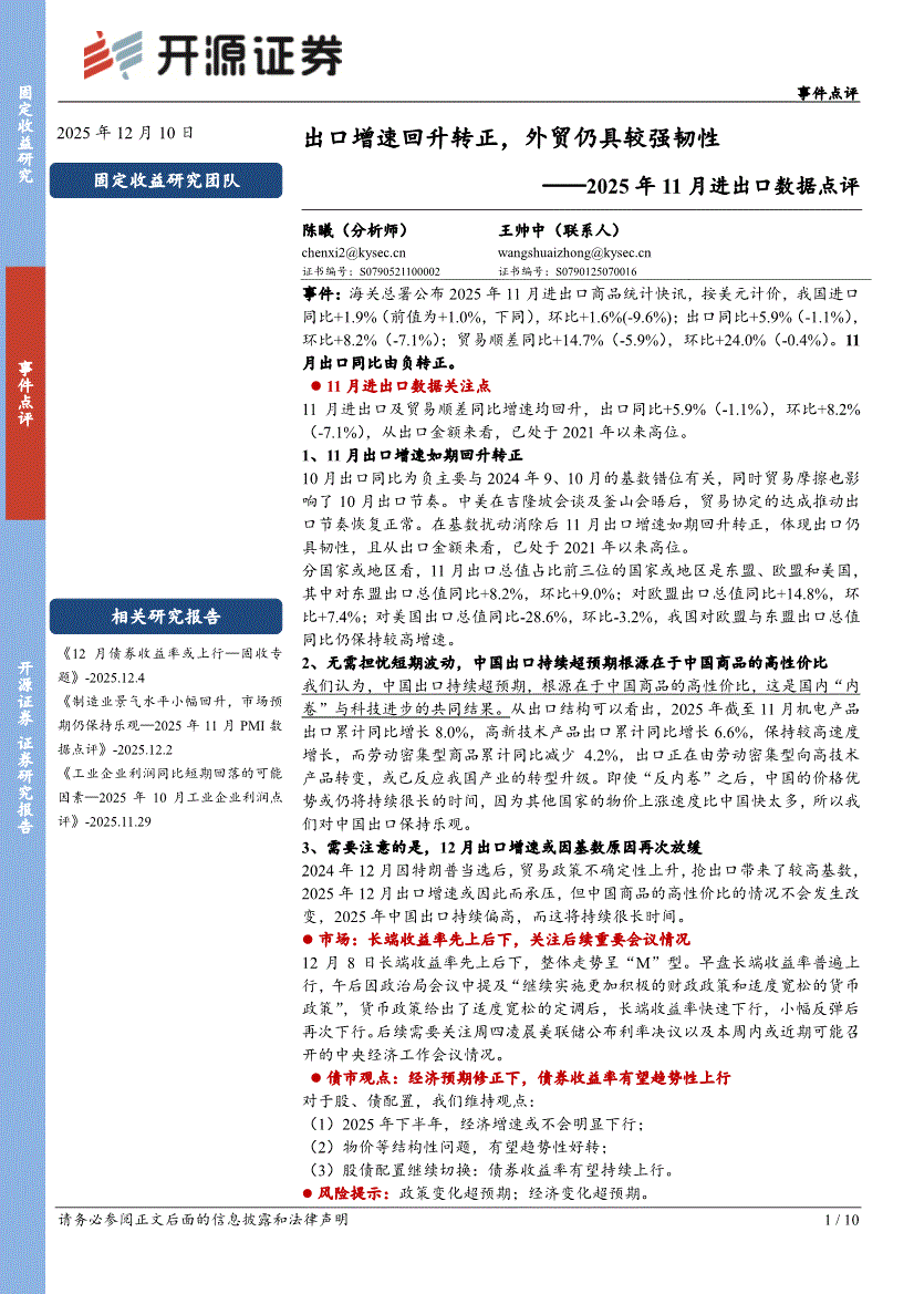 研报:开源证券-2025年11月进出口数据点评:出口增速回升转正,外贸仍具较强韧性-251210