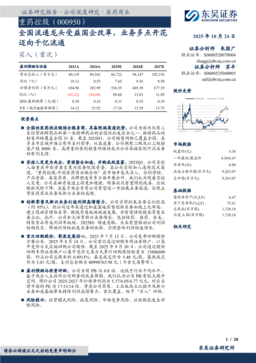 重药控股研报:东吴证券-重药控股-000950-全国流通龙头受益国企改革,业务多点开花迈向千亿流通-251024