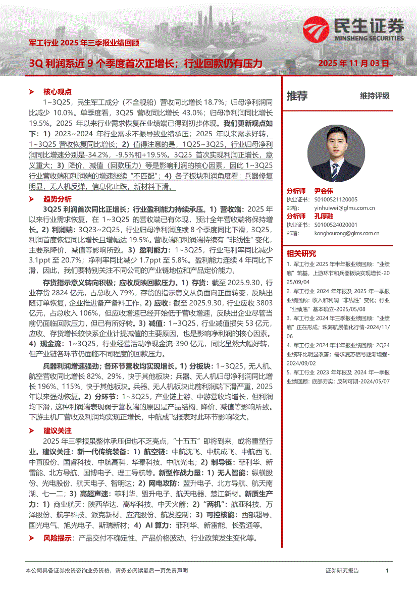 军工行业研报:民生证券-军工行业2025年三季报业绩回顾:3Q利润系近9个季度首次正增长;行业回款仍有压力-251103