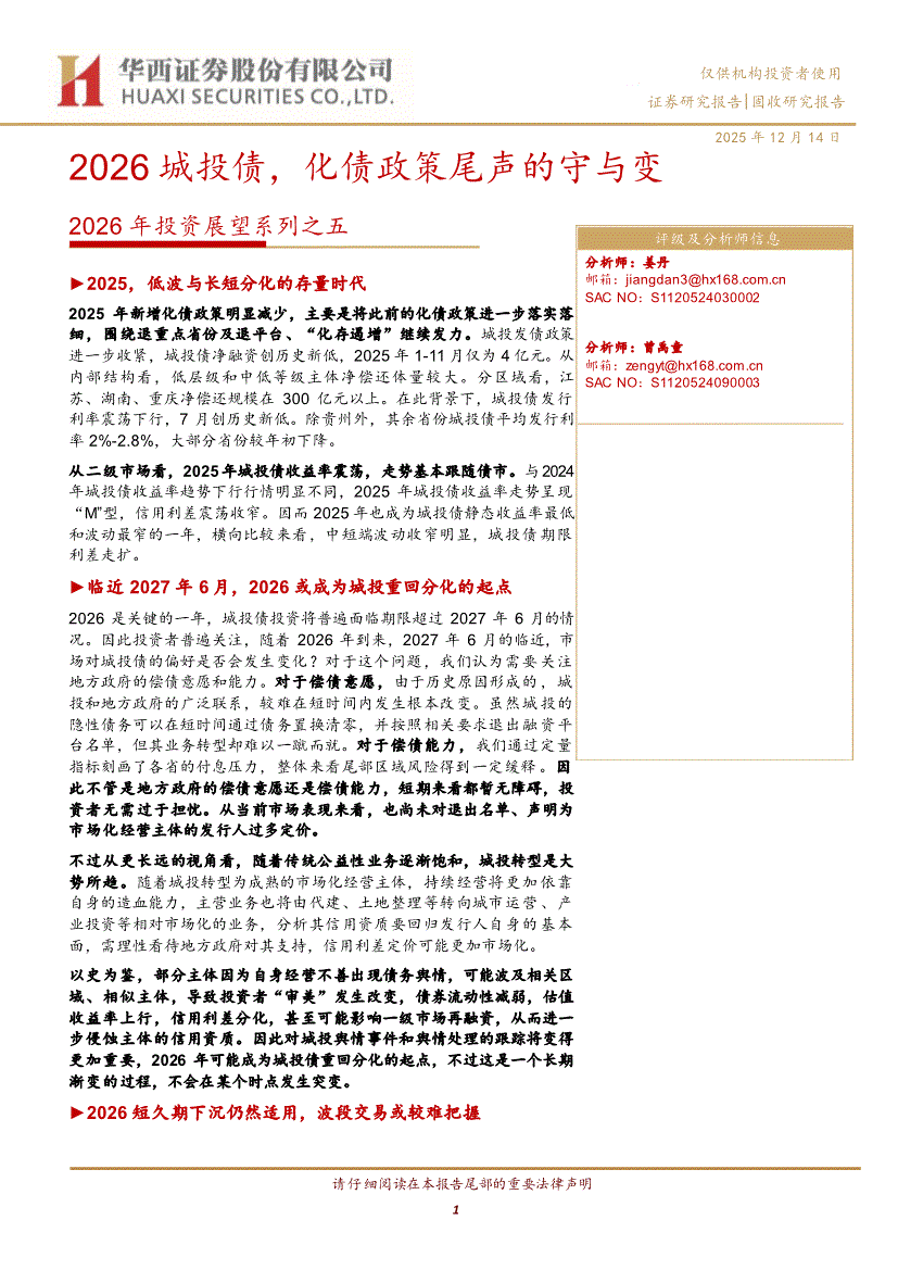 研报:华西证券-2026年投资展望系列之五:2026城投债,化债政策尾声的守与变-251214
