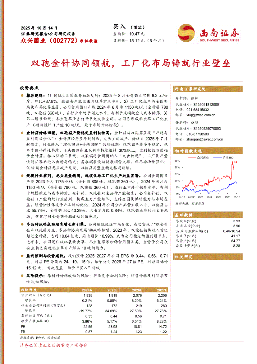 众兴菌业研报:西南证券-众兴菌业-002772-双孢金针协同领航,工厂化布局铸就行业壁垒-251014