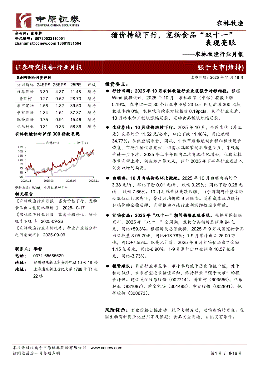农林牧渔行业研报:中原证券-农林牧渔行业月报:猪价持续下行,宠物食品“双十一”表现亮眼-251118