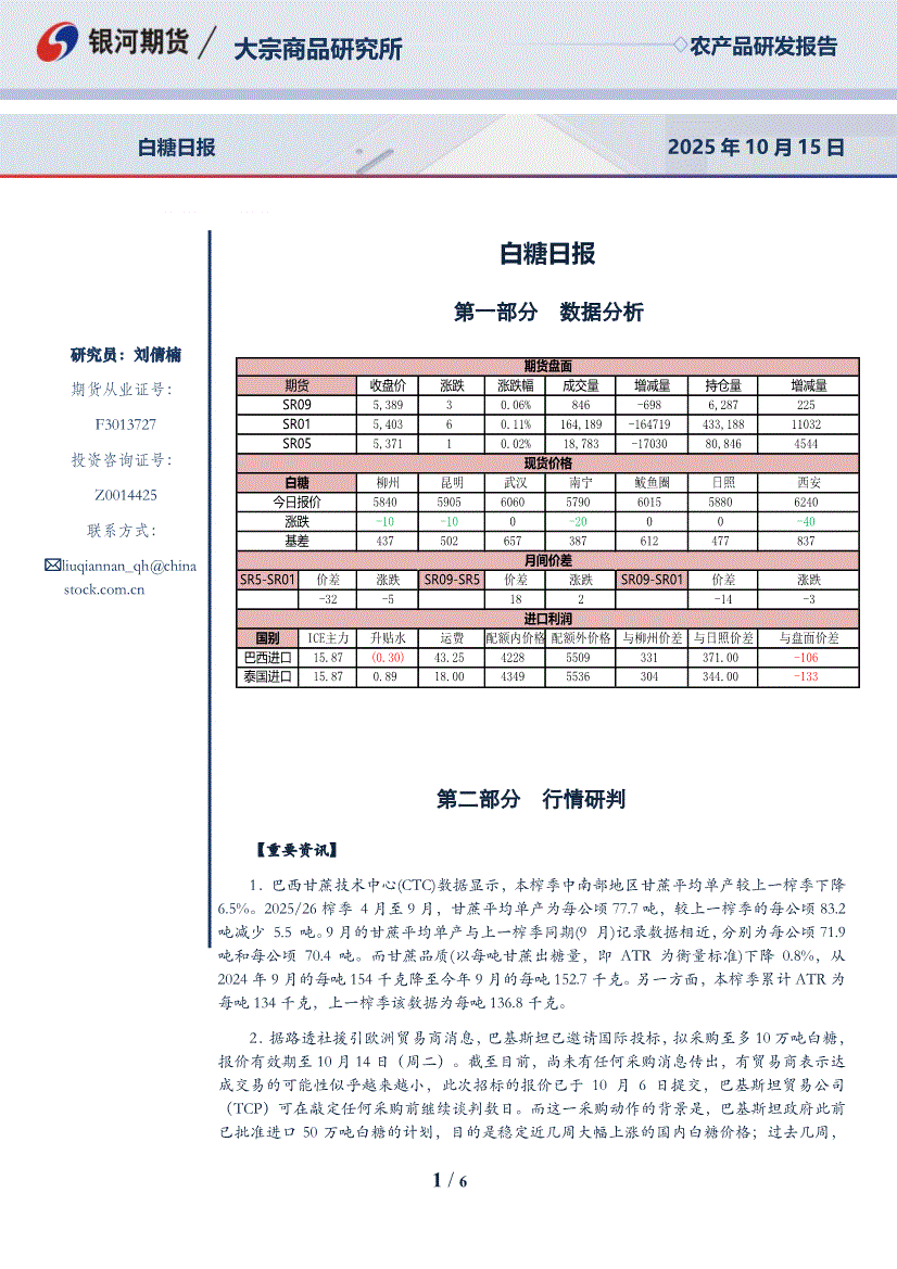 研报:银河期货-白糖日报-251015