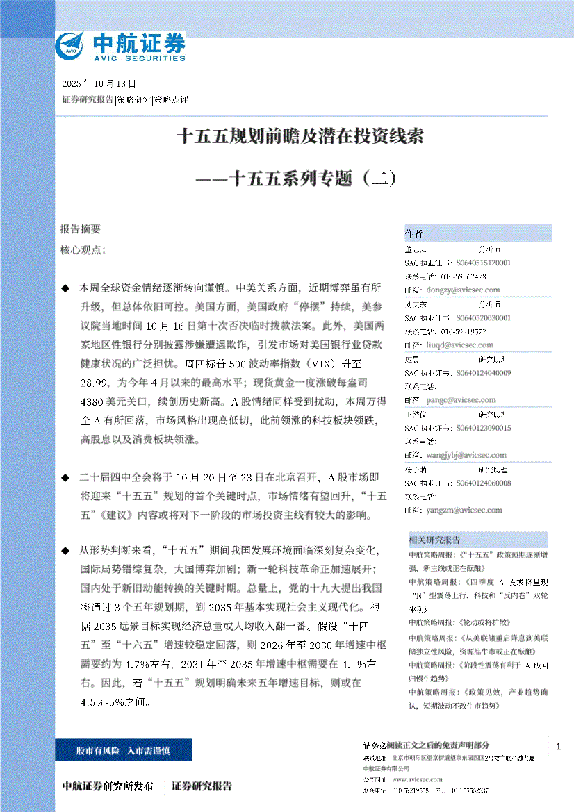 研报:中航证券-十五五系列专题(二):十五五规划前瞻及潜在投资线索-251018