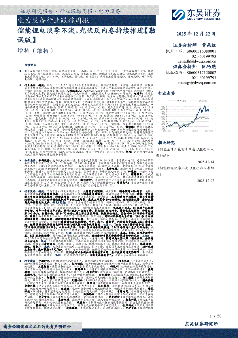 电力设备行业研报:东吴证券-电力设备行业跟踪周报:储能锂电淡季不淡、光伏反内卷持续推进【勘误版】-251222