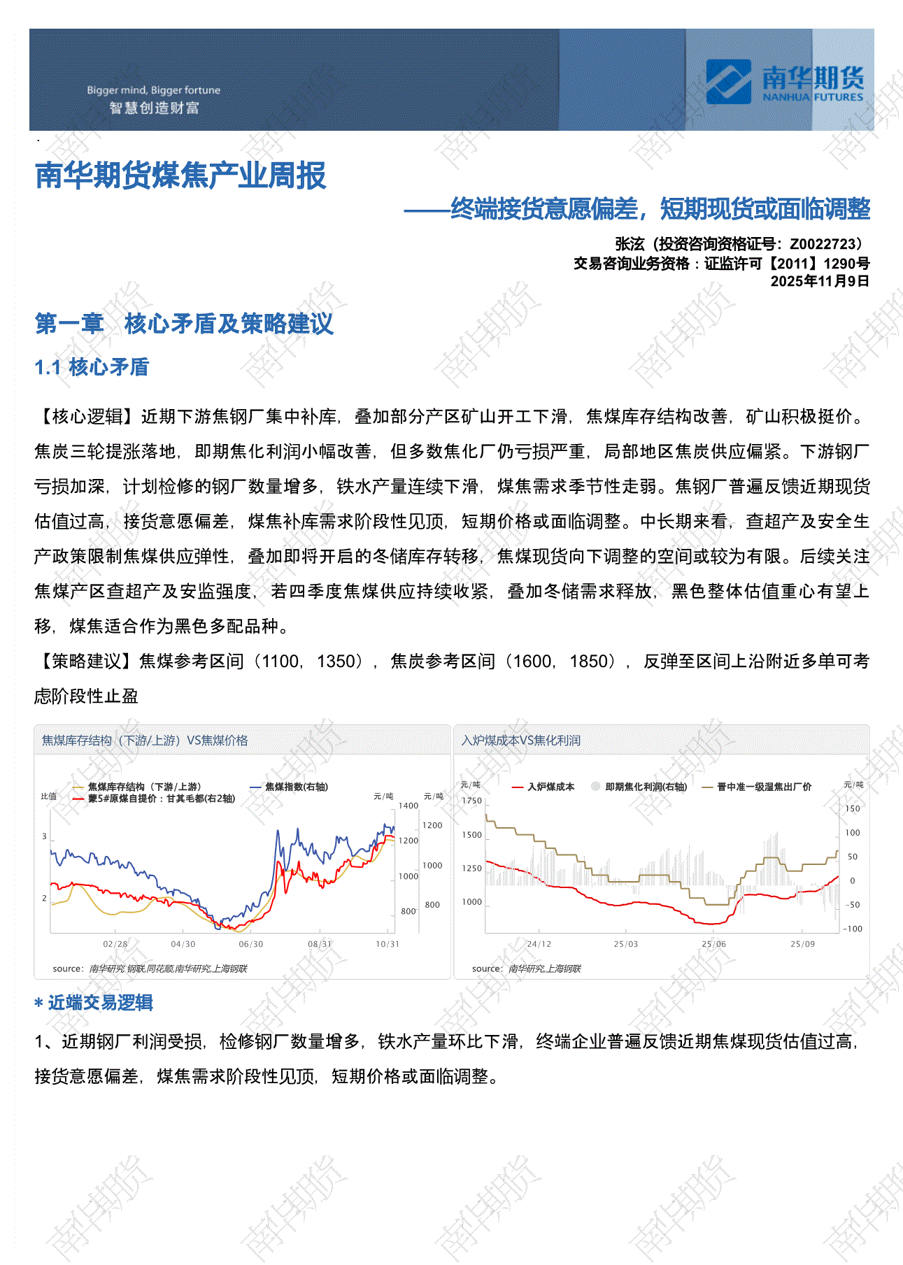 研报:南华期货-煤焦产业周报:终端接货意愿偏差,短期现货或面临调整-251109