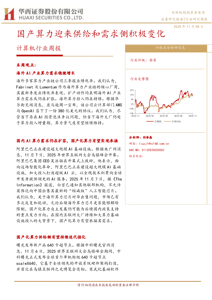 计算机行业研报:华西证券-计算机行业周报:国产算力迎来供给和需求侧积极变化-251108