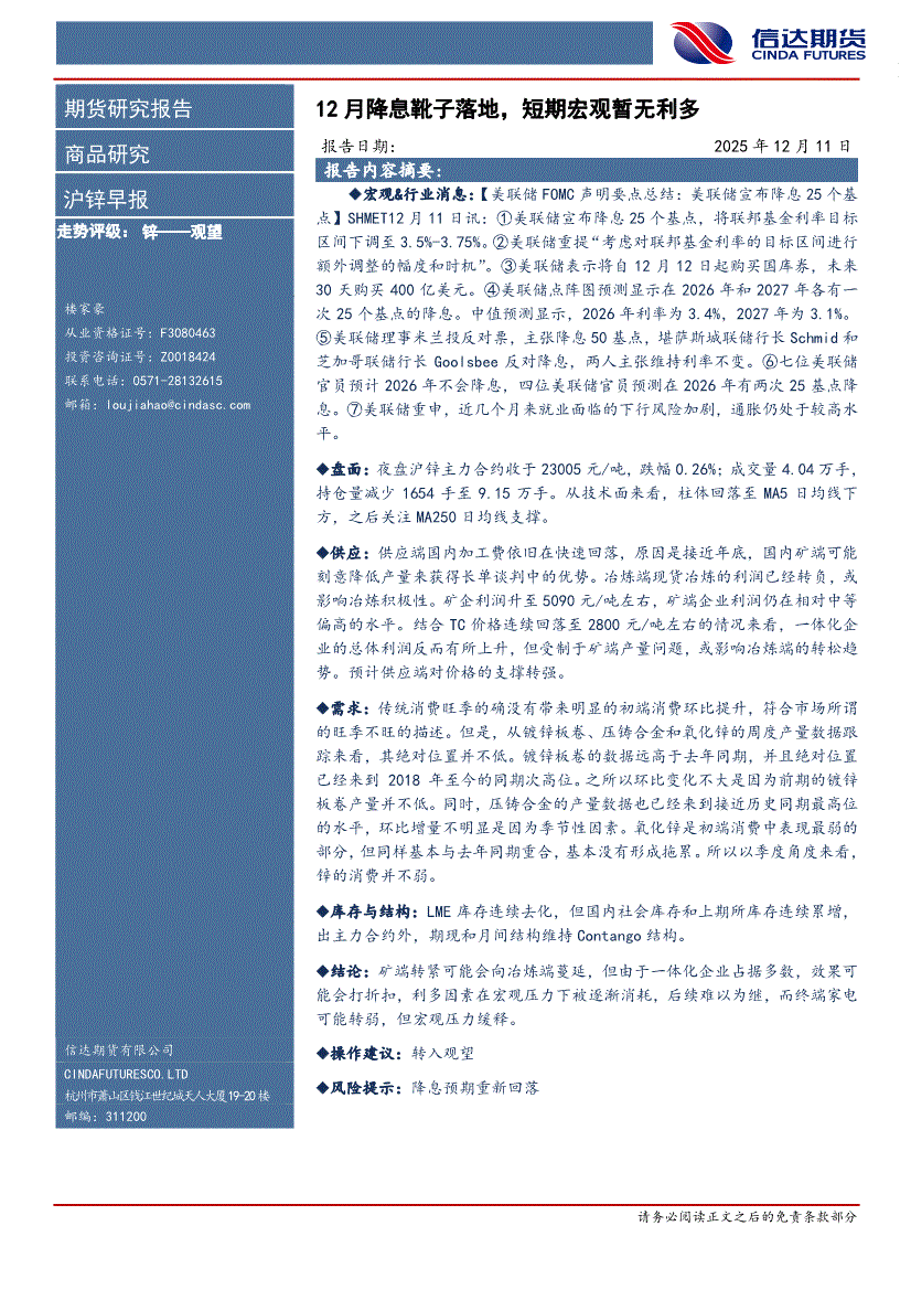 研报:信达期货-沪锌早报:12月降息靴子落地,短期宏观暂无利多-251211