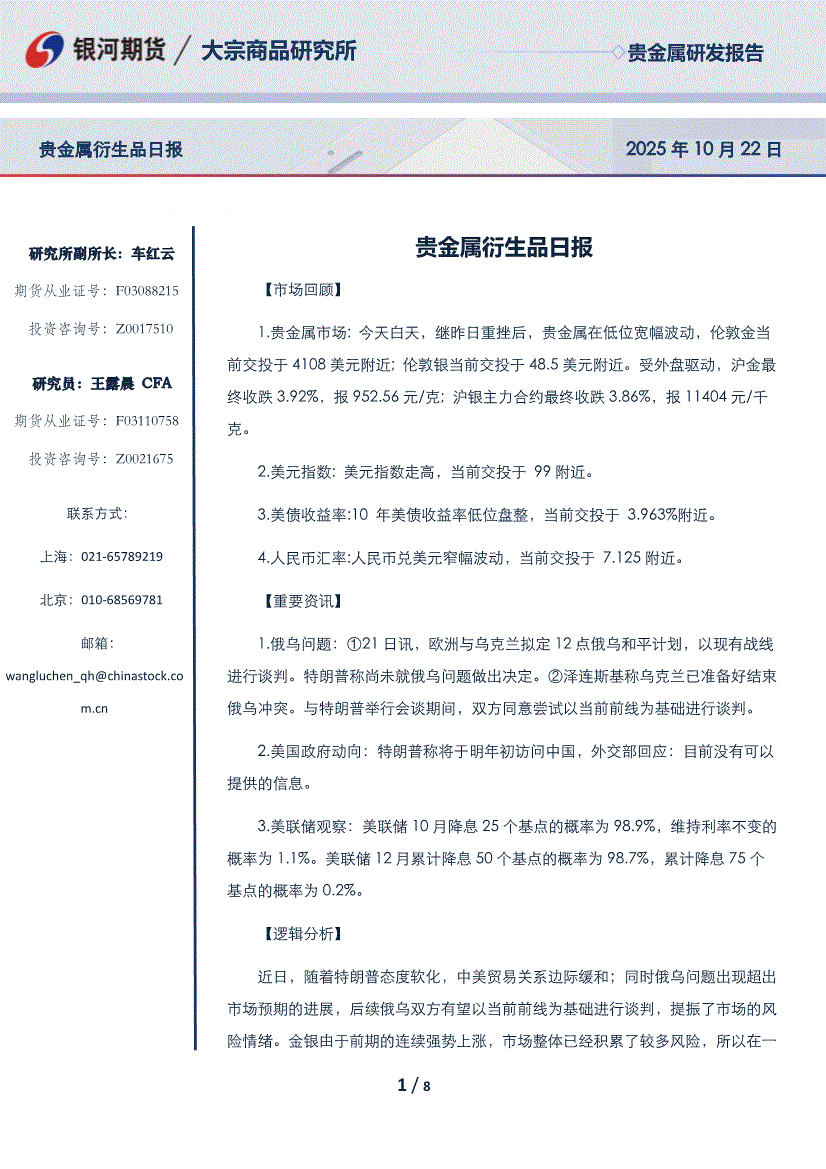 研报:银河期货-贵金属衍生品日报-251022