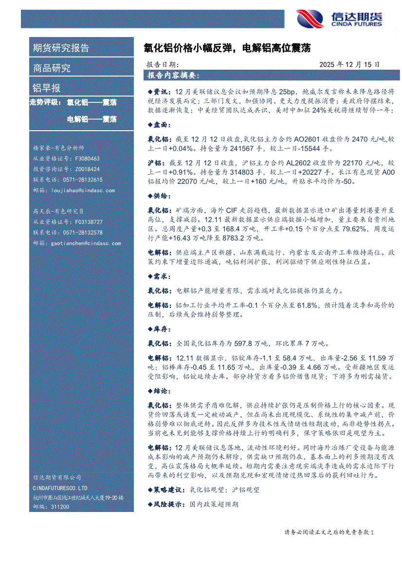 研报:信达期货-铝早报:氧化铝价格小幅反弹,电解铝高位震荡-251215