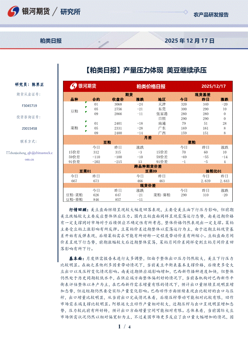 研报:银河期货-【粕类日报】产量压力体现,美豆继续承压-251217