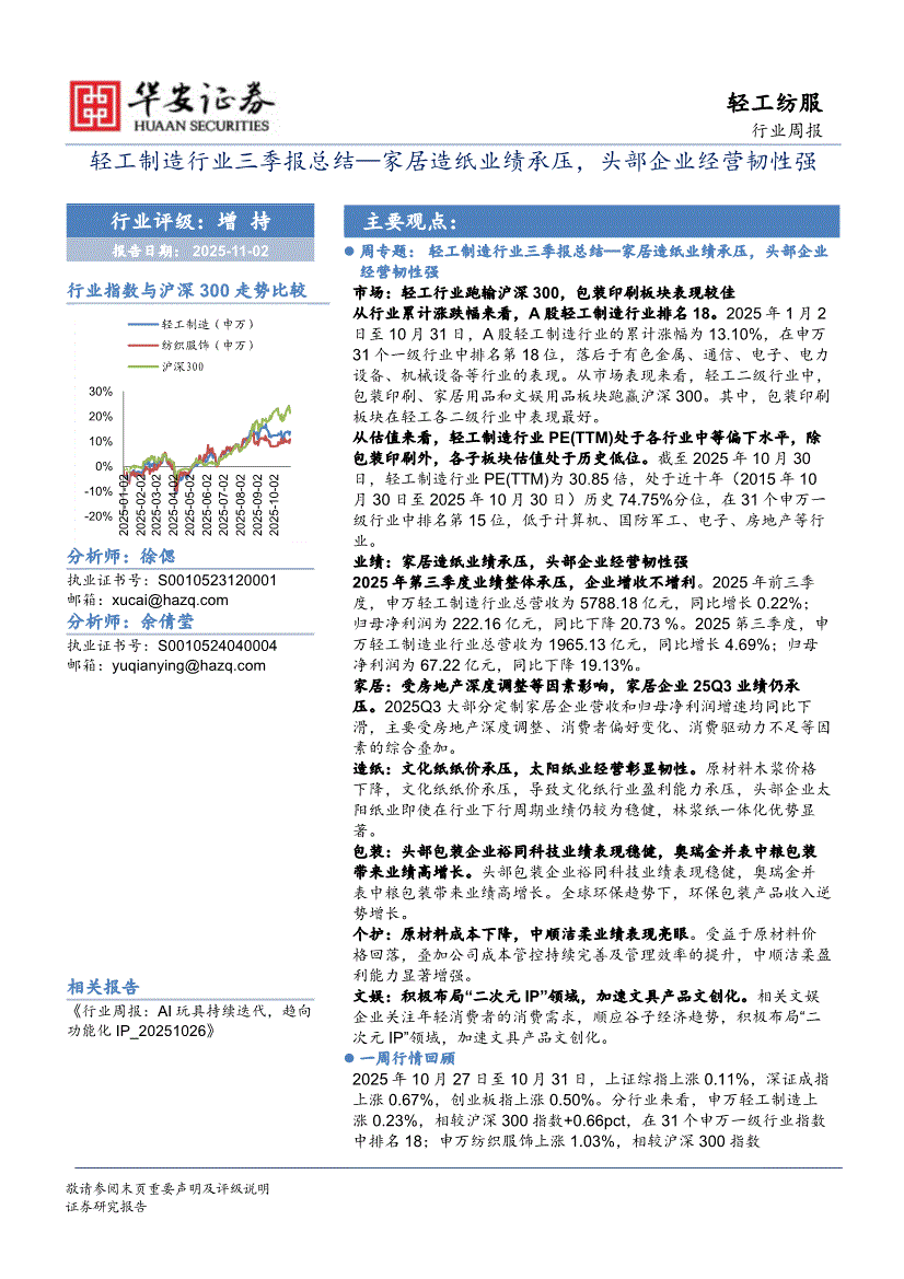 轻工制造行业研报:华安证券-轻工制造行业周报:轻工制造行业三季报总结,家居造纸业绩承压,头部企业经营韧性强-251102