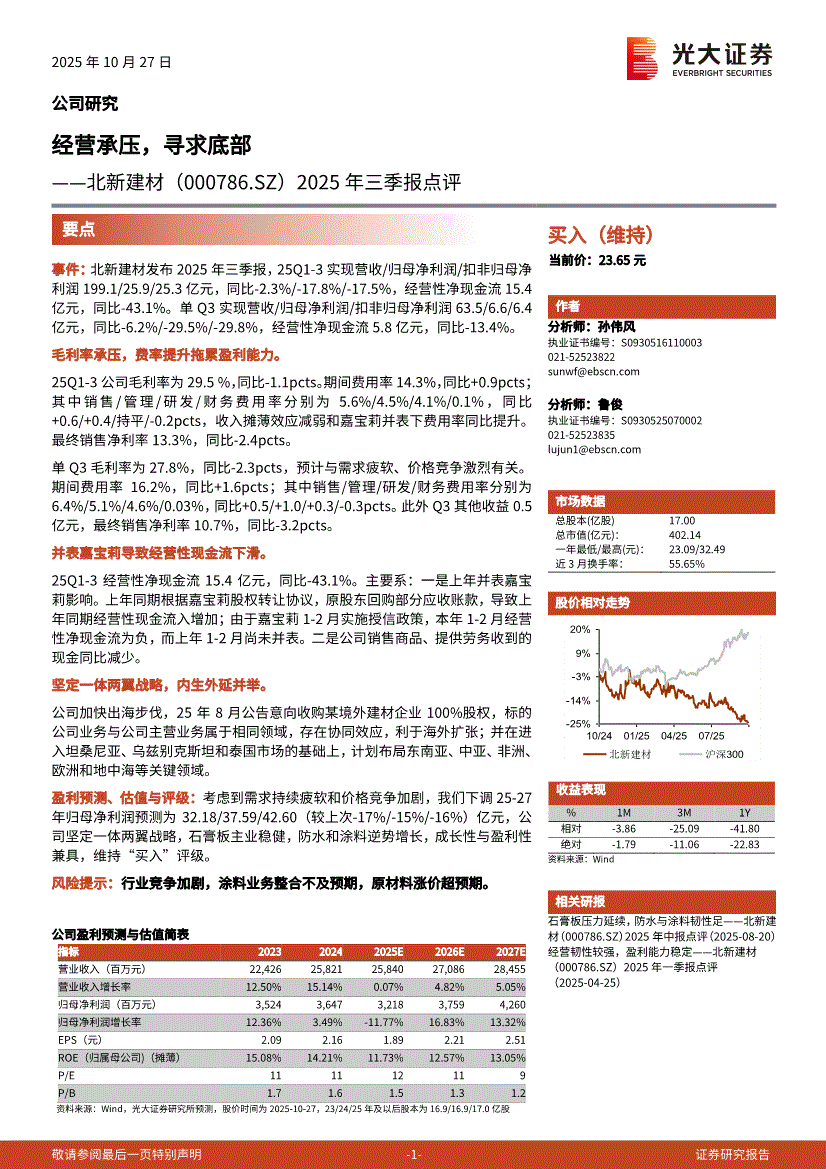 北新建材研报:光大证券-北新建材-000786-2025年三季报点评:经营承压,寻求底部-251027