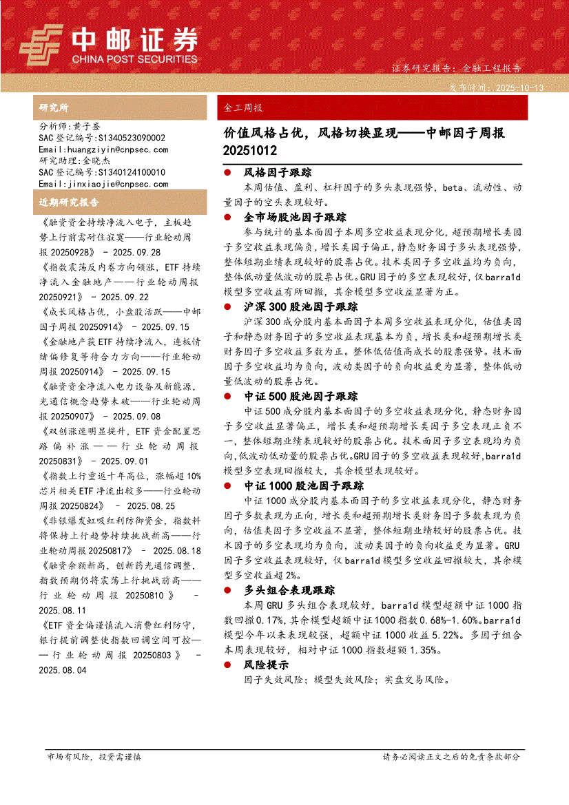 研报:中邮证券-中邮因子周报:价值风格占优,风格切换显现-251013