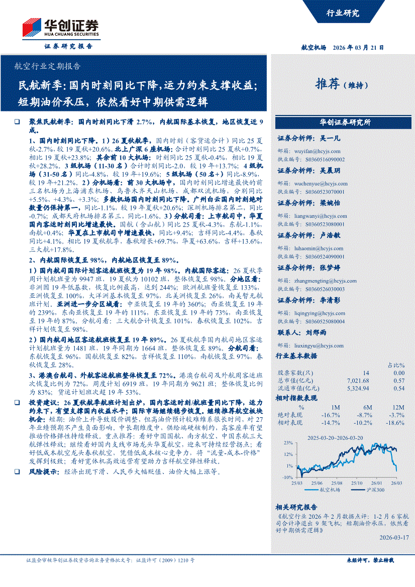 航空行业研报:华创证券-航空行业定期报告:民航新季,国内时刻同比下降,运力约束支撑收益;短期油价承压,依然看好中期供需逻辑-260321